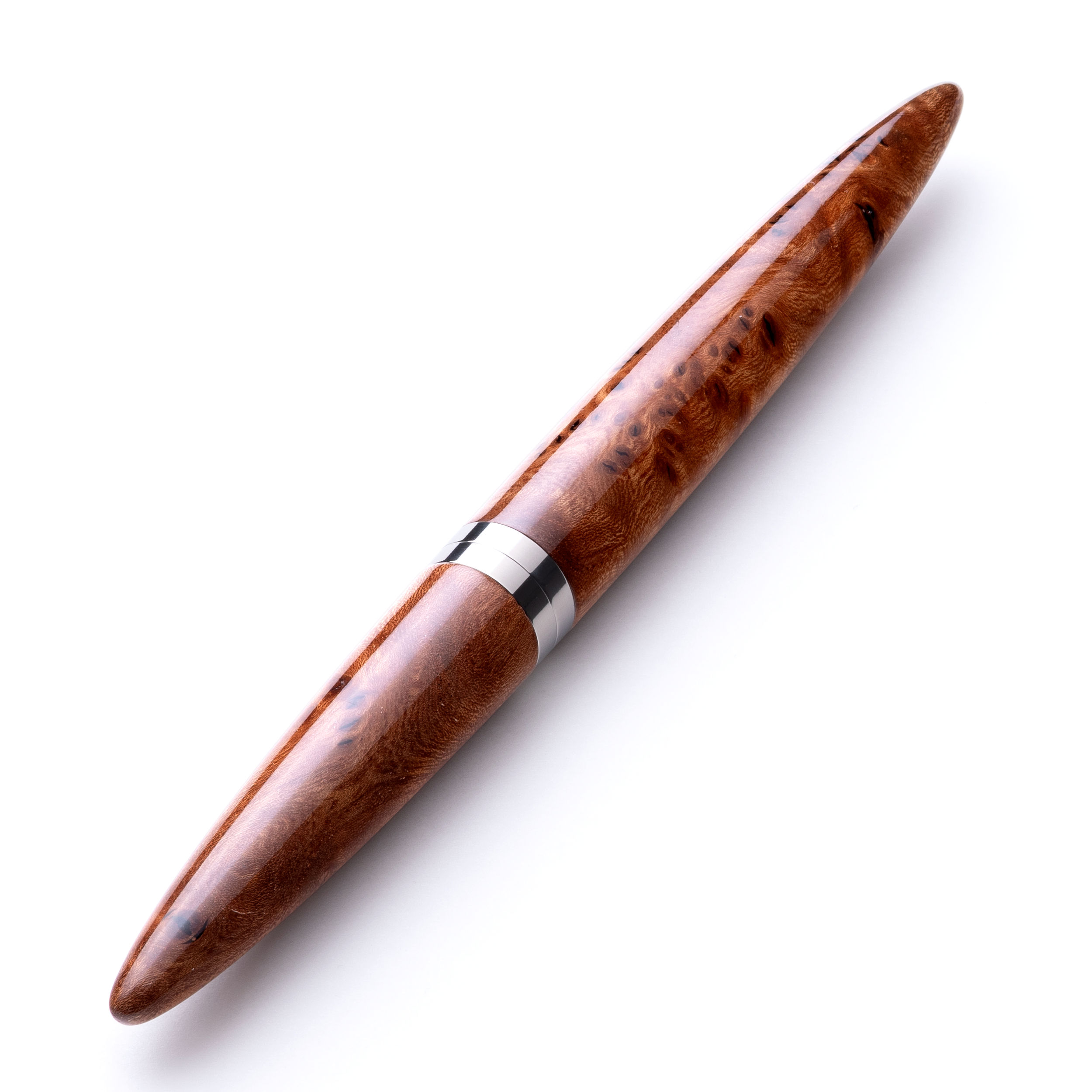 Made from just a single piece of carefully turned wood, each pen is sent to Sardinia, where lacquer is carefully applied via hand precisely and perfectly sanded and polished layer by layer until a a clear glossy finish is achieved, something to perfectly frame and enhance every detail of the wooden surface, after the lacquer has been applied the pen is returned to Germany, where it is completed with a polished titanium section, carefully designed with the perfect weight and shape to ensure writing comfort, the pen is available with a finely tuned, stainless steel, 14k gold, or Platinum nib.