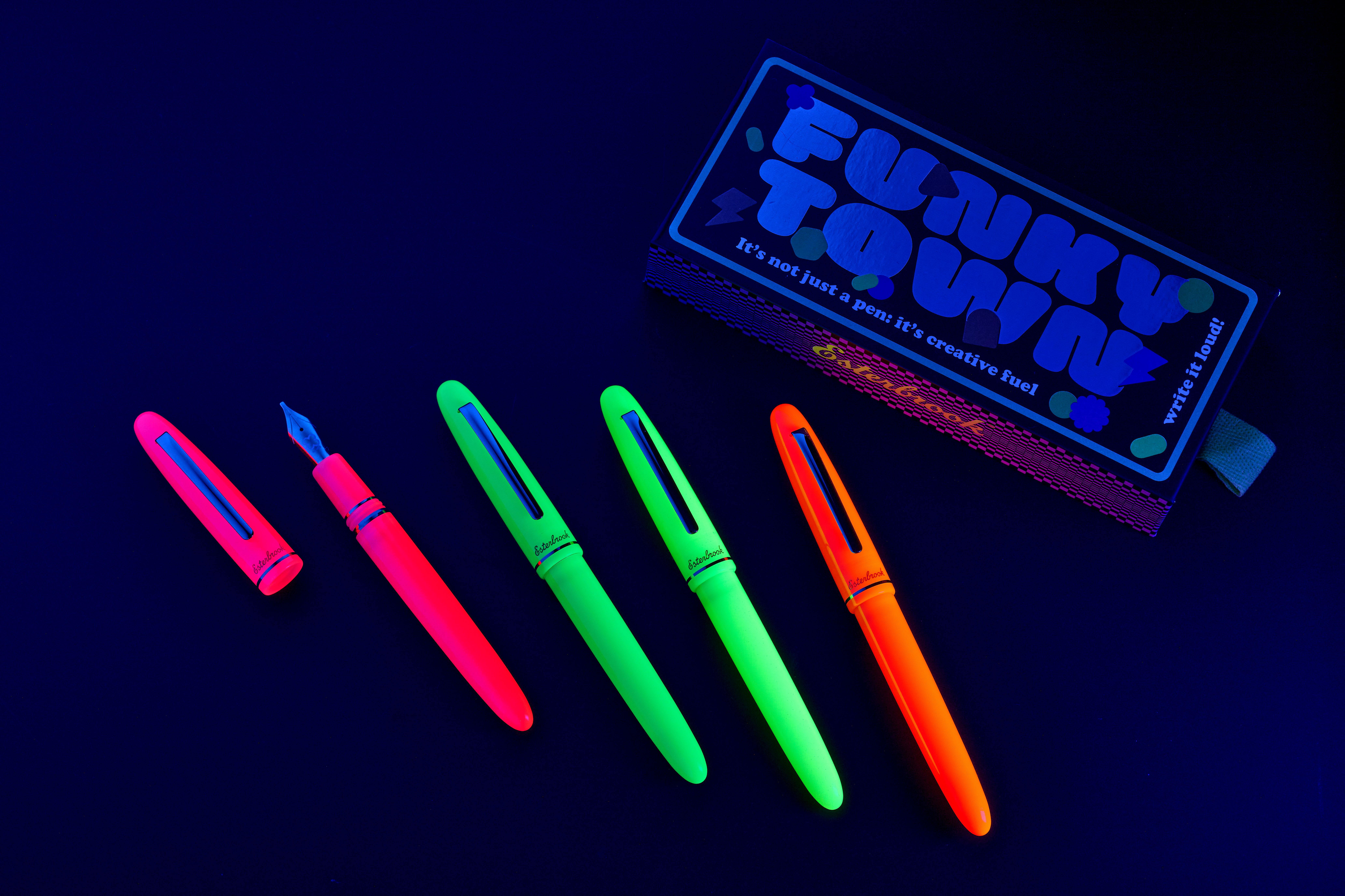 Funky town, the latest Estie from Esterbrook, is as bright and bold as they are. Perfect for writers and artists who need a pen that’s just as vivid and exciting as their imagination, the Funky town reimagines the classically inspired design of the Estie with a bright splash of Neon pink colour, keeping the carefree spirit of 70s disco alive with its electric design. If you somehow manage to get bored of your neon pink Estie, just shine a black light on it to transform the pen in to a spectacular vivid glowing pink, You’ll never loose your pen again!