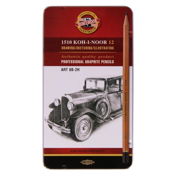 This set of 12 Graphite pencils from Koh-I-Noor contains several soft grades of pencils from 8B – 2H which are ideal for sketching. The graphite has been formulated to have a high Opacity and good lightfastness while remaining easy to erase. This set comes in a metal tin which can be used as a great way to store your pencils.