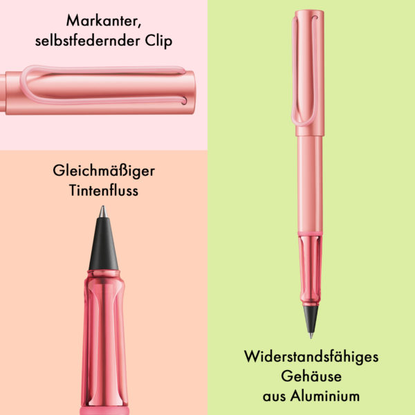 This Rollerball has been coloured in a playful pastel pink Flamingo colour! it comes with a matching clip as well as a translucent pink section. The practical design of the Al-star pairs great with the bright and vibrant colour. Can be refilled with Lamy’s M63 Rollerball refills.