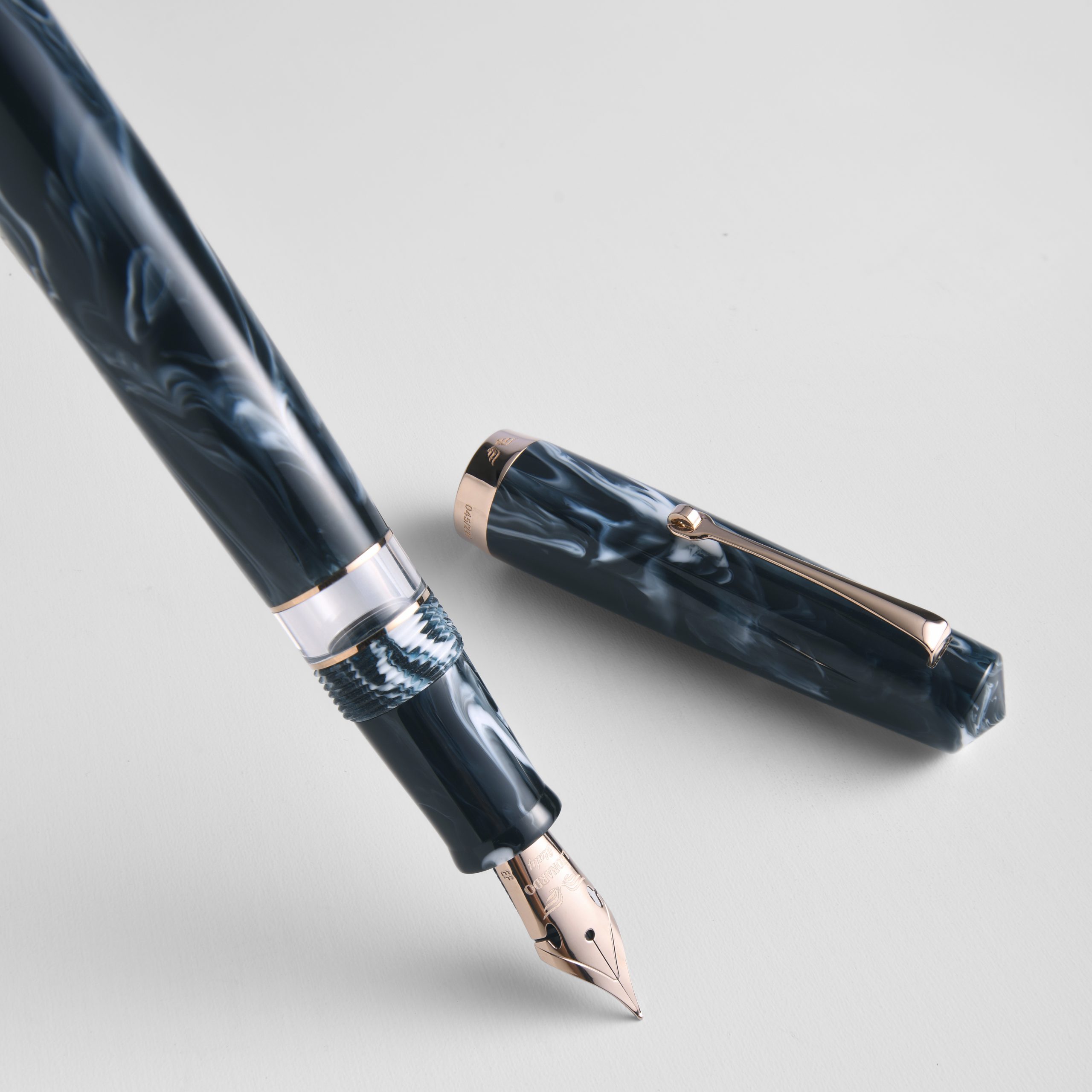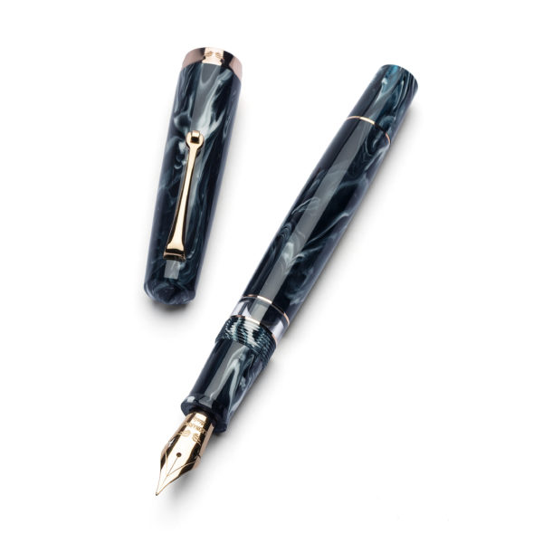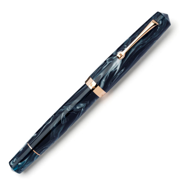 Leonardo Fantasie is a combination of two different worlds, the delicate artistry of Leonardo’s Italian fountain pen design, and the vibrant and experimental resin designs of Jonathon Brooks, these two worlds come together to create a Momento Magico fountain pen that feels truly special, able to fully highlight the subtly layered navy colour of the Arctic Blast resin, as it ripples with streaks of cold white, enhanced by a rose gold trim each resin has its own unique pattern, personal to it.