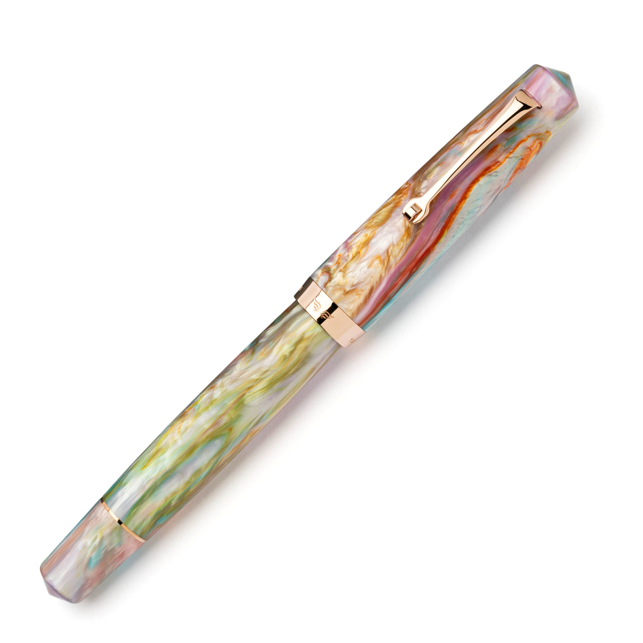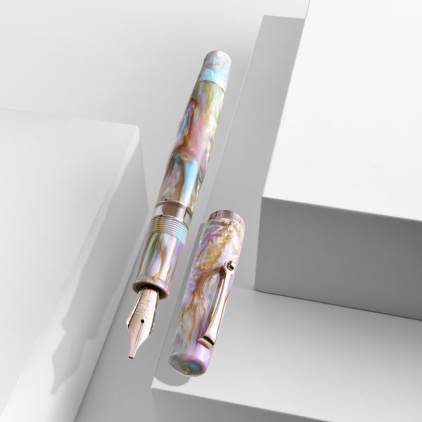Limited to a series of only 226 pens the nature of the resin means that each swirling pattern and every blend of colours is unique to each pen, making every one special and individual. finished with a rose gold trim and a special cap band only available on the Fantasie models the pen has been carefully tuned by Leonardo to ensure an excellent writing experience and is available in sizes from extra fine, to a 1.5 stub.
