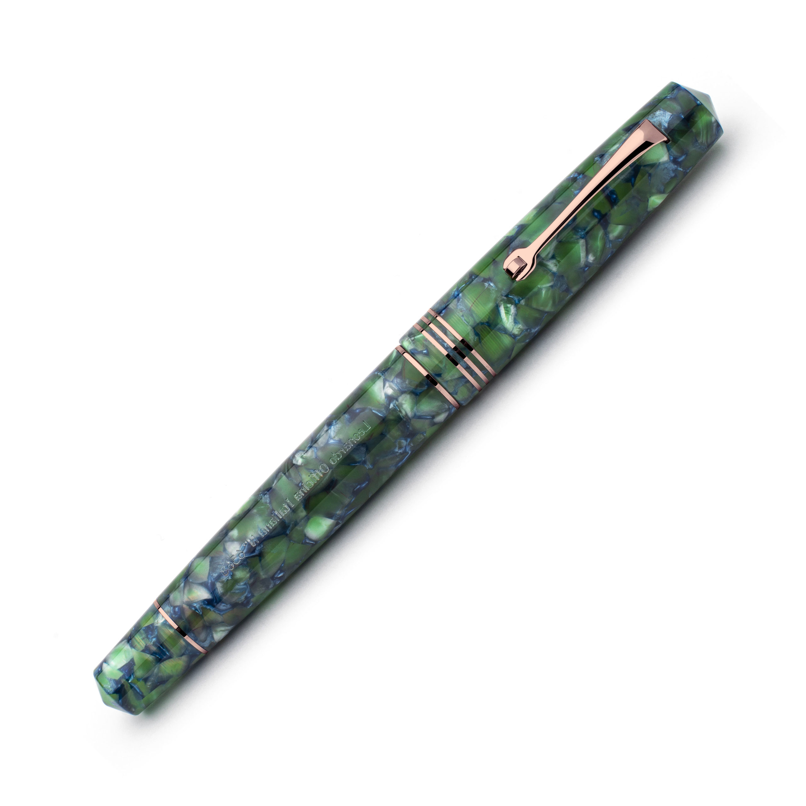 The Iride Green Blue resin is a mixture of light and dark greens with a pearlised blue weaving inbetween, creating depth throughout the body and cap.