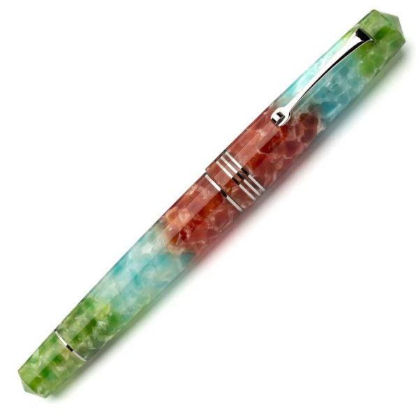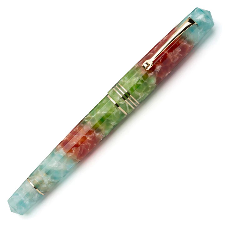 is a lovely resin created with a mixture of swirling colours. Pink, red and orange being the dominant colours then separated with white and black in between, giving depth. A shimmering of glitter throughout is complimented superbly by the rose gold trim found on the clip, rings and nib.