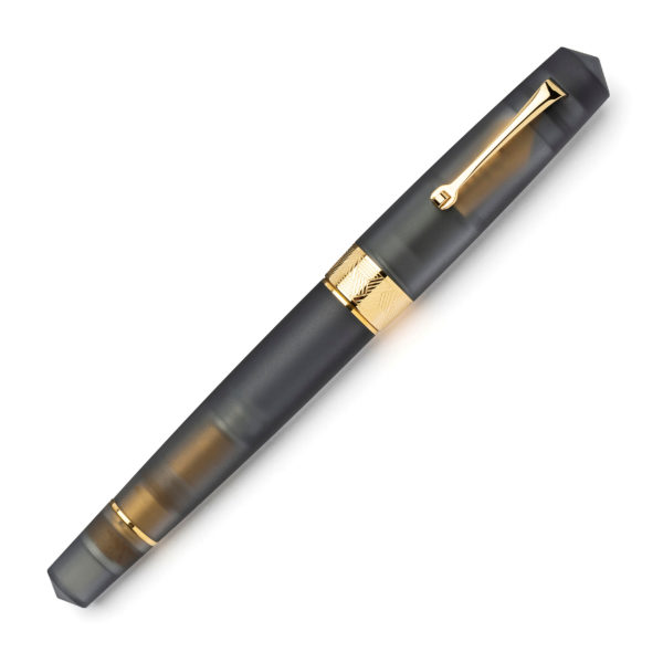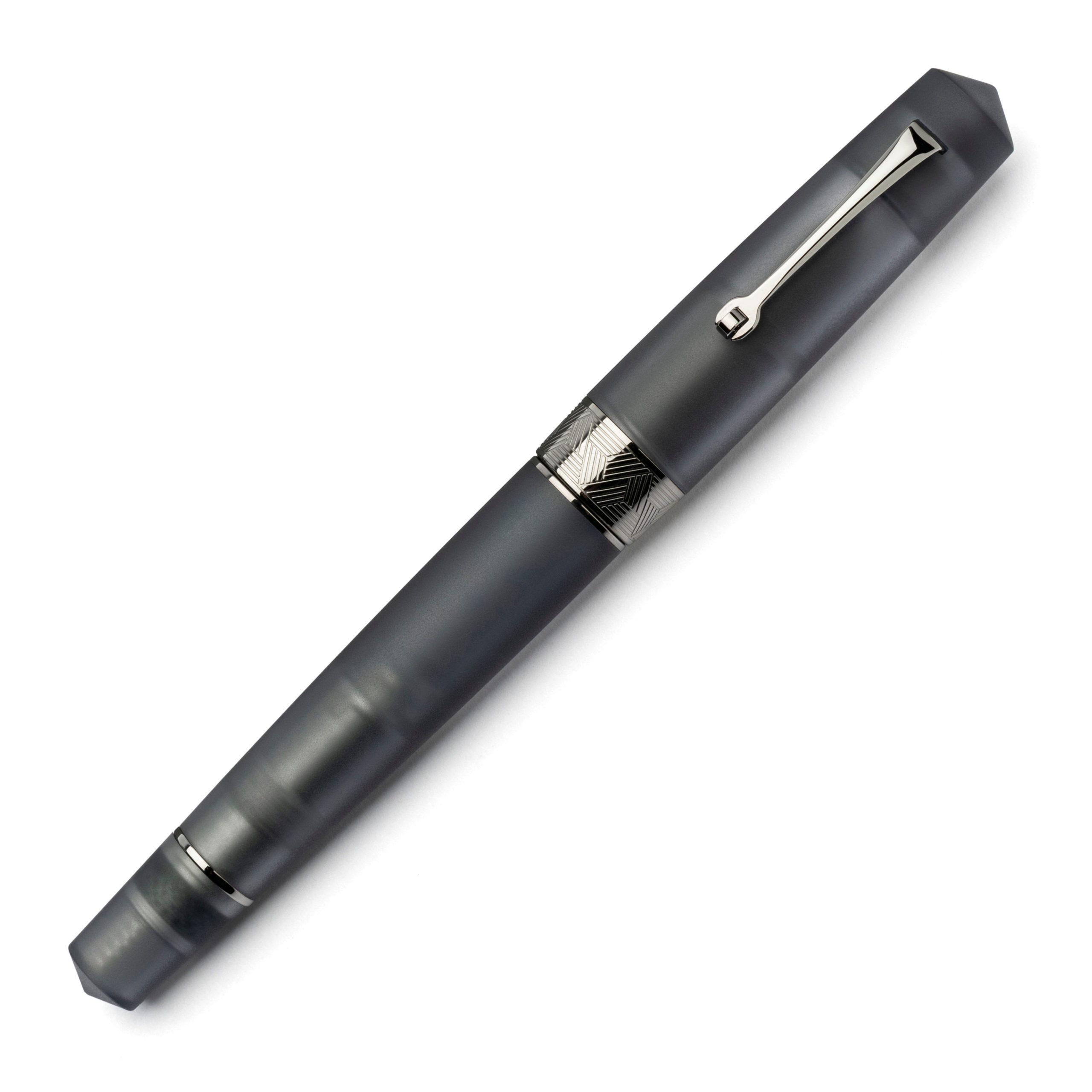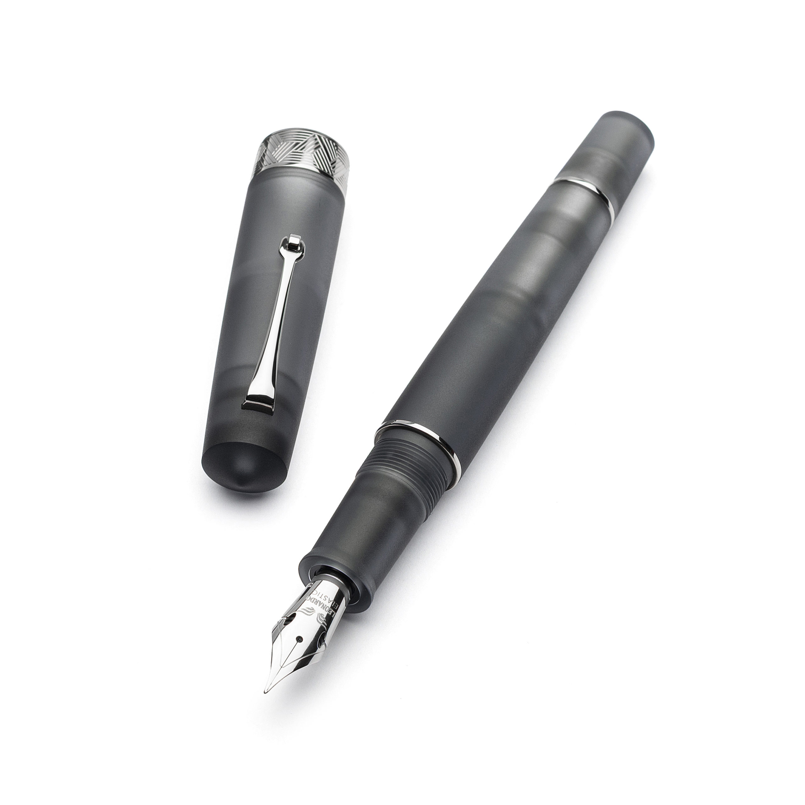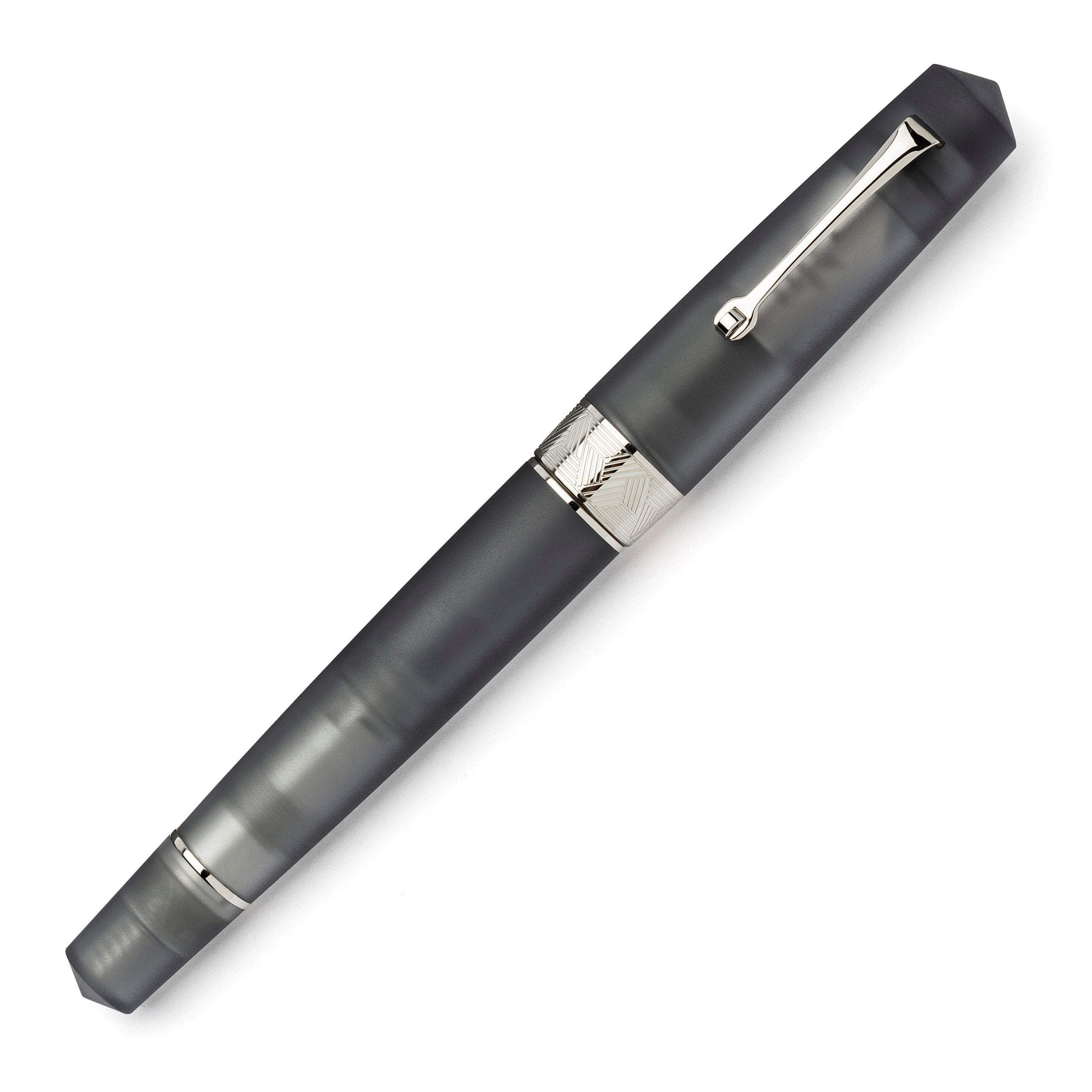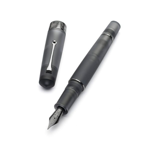 Leonardo have created the Pura as a reimagining of their oversized Momento Zero Grande Fountain pen, featuring the same shape but now with a deep translucent resin that hints at the inside workings of the pen, The deep grey colour of the resin is enhanced by this subtly transparency adding extra depth as light diffuses through the body of the pen. Instead of the Momento Zero Grande’s typical three banded cap the Pura features a large single band, that has been delicately carved using a three dimensional pantograph to create a textured geographic design, the harsh lines and precise angles of which perfectly compliment and contrasting with the soft frosted material.