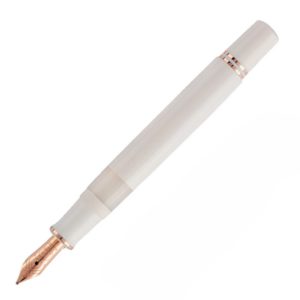 It is a mid- sized cartridge converter pen. The resin is a compilation of cream, pale blue and browns with a glossy finish. The shape is conservative – a slight tapering from the centre to the knob and cap. The section has the merest fluting to prevent you finger slipping onto the nib. The cap band is the traditional Radius design, featuring a diamond and extended oblong pattern.