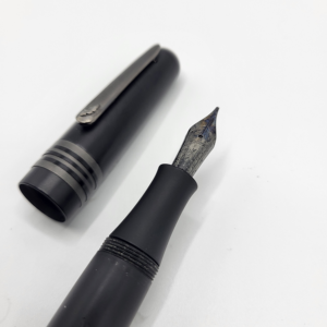 It is a mid- sized cartridge converter pen. The colour is all black, found on the cap, barrel and section in a pleasant matte finish. The shape is conservative – a slight tapering from the centre to the knob and cap. The section has the merest fluting to prevent you finger slipping onto the nib. The cap band is the traditional Radius design, featuring a diamond and extended oblong pattern.