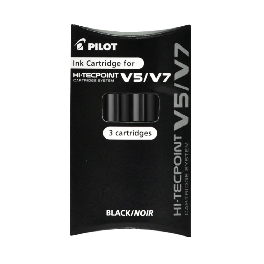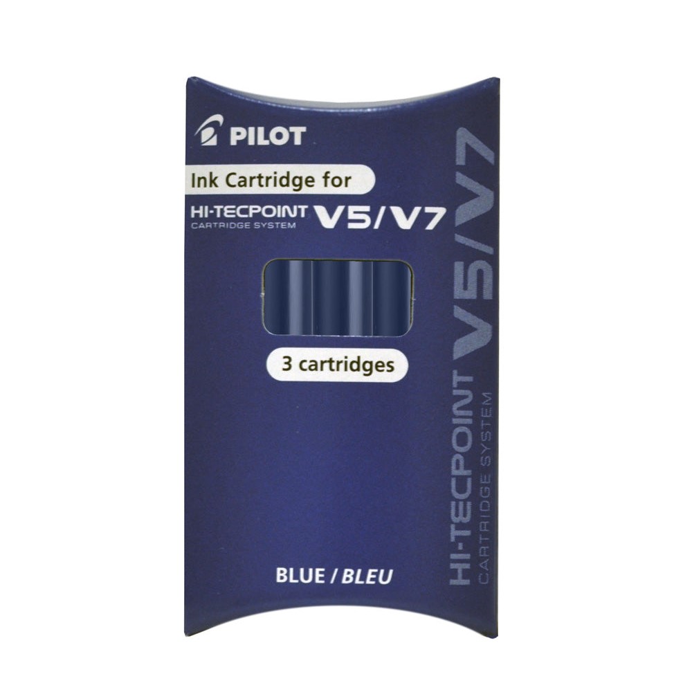 Designed for Pilots Hi-Techpoint V5 & V7 Rollerball pens, this pack contains three replacement cartridges, with either blue or black ink, not suitable for use in fountain pens