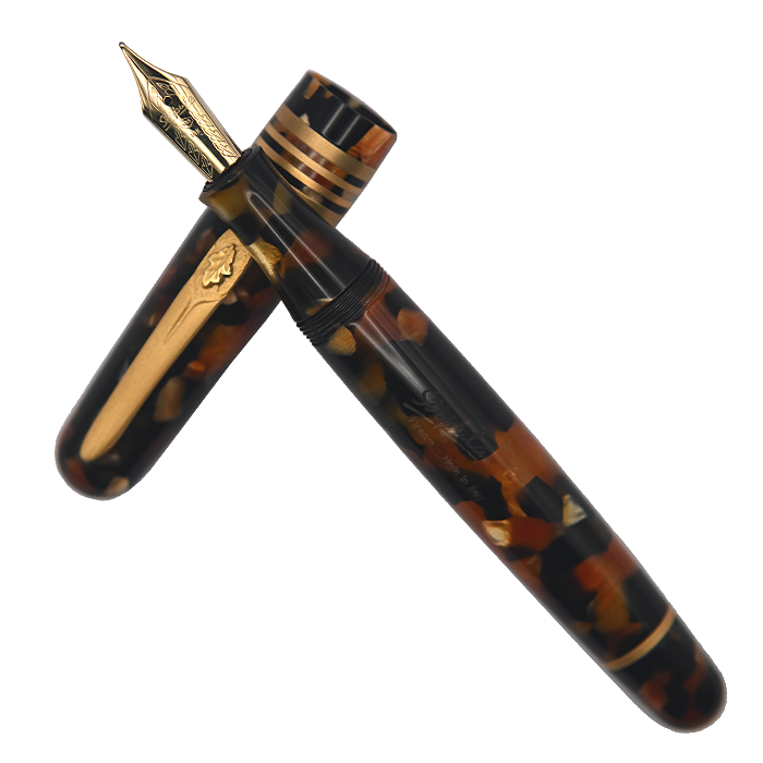 Blending the red-brown hues of the tortoiseshell design with the gold detailing of the pen, the Rocca d’Anghiari attempts to evoke the colours of the ancient fortresses that line the Tiber valley. Featuring a golden trim on the cap and clip, both of which are chiseled in a Florentine goldsmith style.
