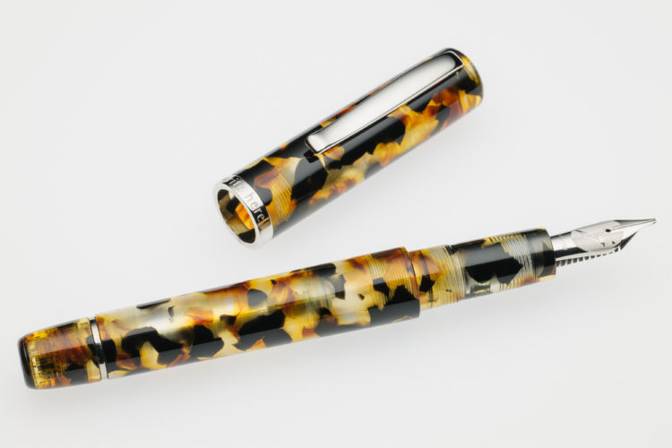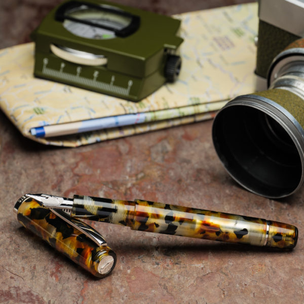 The Write Here SCRIBO Africa is the sixth pen in this series. .The material is translucent with flecks of black, gold and brown. Made by Scrittura Bolognese, the team which arose from the ashes of OMAS, this new pen retains the ideal proportions and balance that have made this pen so popular. Designed by Flaminia Angelone back in 2017 the design is simple and uncluttered. There is a slight taper to both cap and barrel. A long section gives plenty of space to accommodate your favoured grip and gives perfect balance.